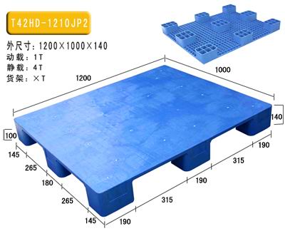 產品型號: HD-1210JP2 產品貨號: T42 產品外尺寸: 1200×1000×140 產品內尺寸: 產品結構: 九腳平板 產品內容量(L): 承重量(T): 動載:1T 靜載:4T 貨架:X 產品認可標準: 此款塑料托盤適用平地墊倉使用,防潮效果好,且易于清洗;