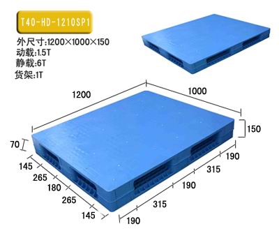 產(chǎn)品型號: AT-1210SP1 產(chǎn)品貨號: T40 產(chǎn)品外尺寸: 1200×1000×150 產(chǎn)品內(nèi)尺寸: 產(chǎn)品結(jié)構(gòu): 雙面平板 產(chǎn)品內(nèi)容量(L): 承重量(T): 動載:1.5T 靜載:6T 貨架:1T 產(chǎn)品認(rèn)可標(biāo)準(zhǔn): ISO9001:2000質(zhì)量體系認(rèn)證 此款塑料托盤為雙面平板面重型;