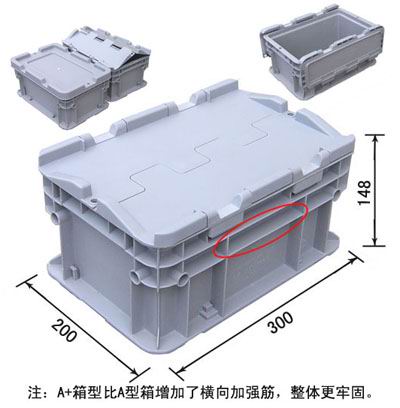 - 項(xiàng) 目A型箱B型箱C型箱D型箱H型箱AA+BB+CC+DD+HH+外尺寸(mm)300*200*148400*300*148400*300*280600*400*280600*400*148內(nèi)尺寸(mm)260*160*130355*260*130355*260*260555*365*260555*365*12520尺標(biāo)準(zhǔn)柜可裝3200160080040080040尺標(biāo)準(zhǔn)柜可裝70403500175088017501210標(biāo)準(zhǔn)托盤單層可堆20101055單個(gè)箱內(nèi)容積(L)5.4122452.725.4備 注1、每種箱均可選配平面型或外翻型箱蓋。2、帶“+”號(hào)箱型均比原箱型增加了加強(qiáng)筋設(shè)計(jì),箱體更牢固。